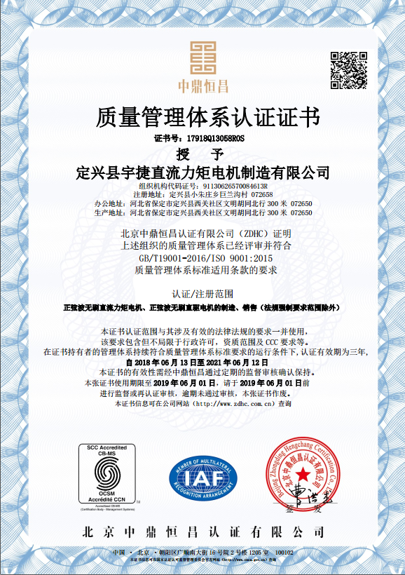 河北宇捷電機(jī)科技有限公司通過(guò)質(zhì)量管理體系認(rèn)證